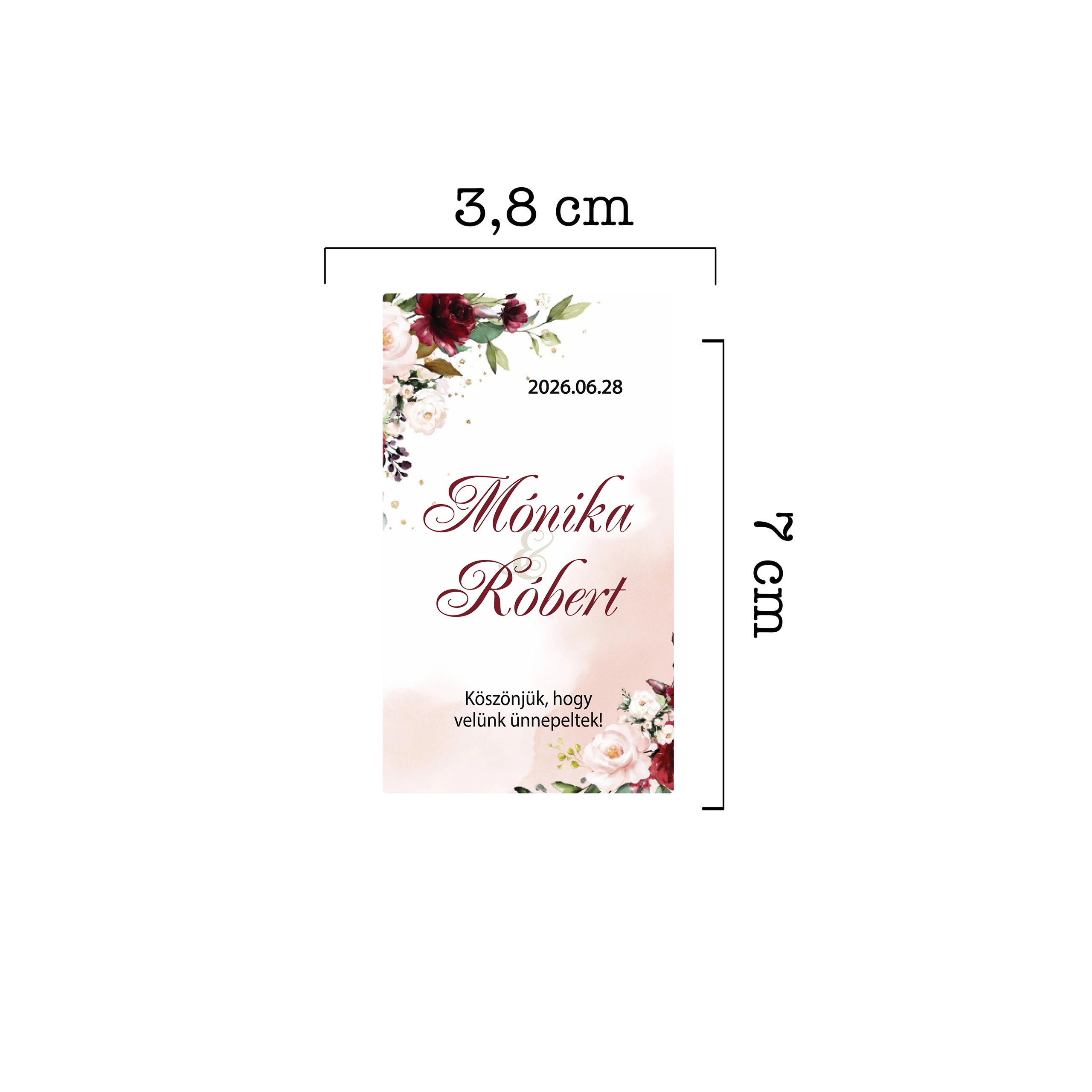 Tegye felejthetetlenné a Nagy Nap apró részleteit is! ✨ Ez a gyönyörű, személyre szabható bordó virágos esküvői címke tökéletes kiegészítője a köszönetajándékoknak, legyen szó házi pálinkáról, borról, mézről vagy bármilyen apró meglepetésről.