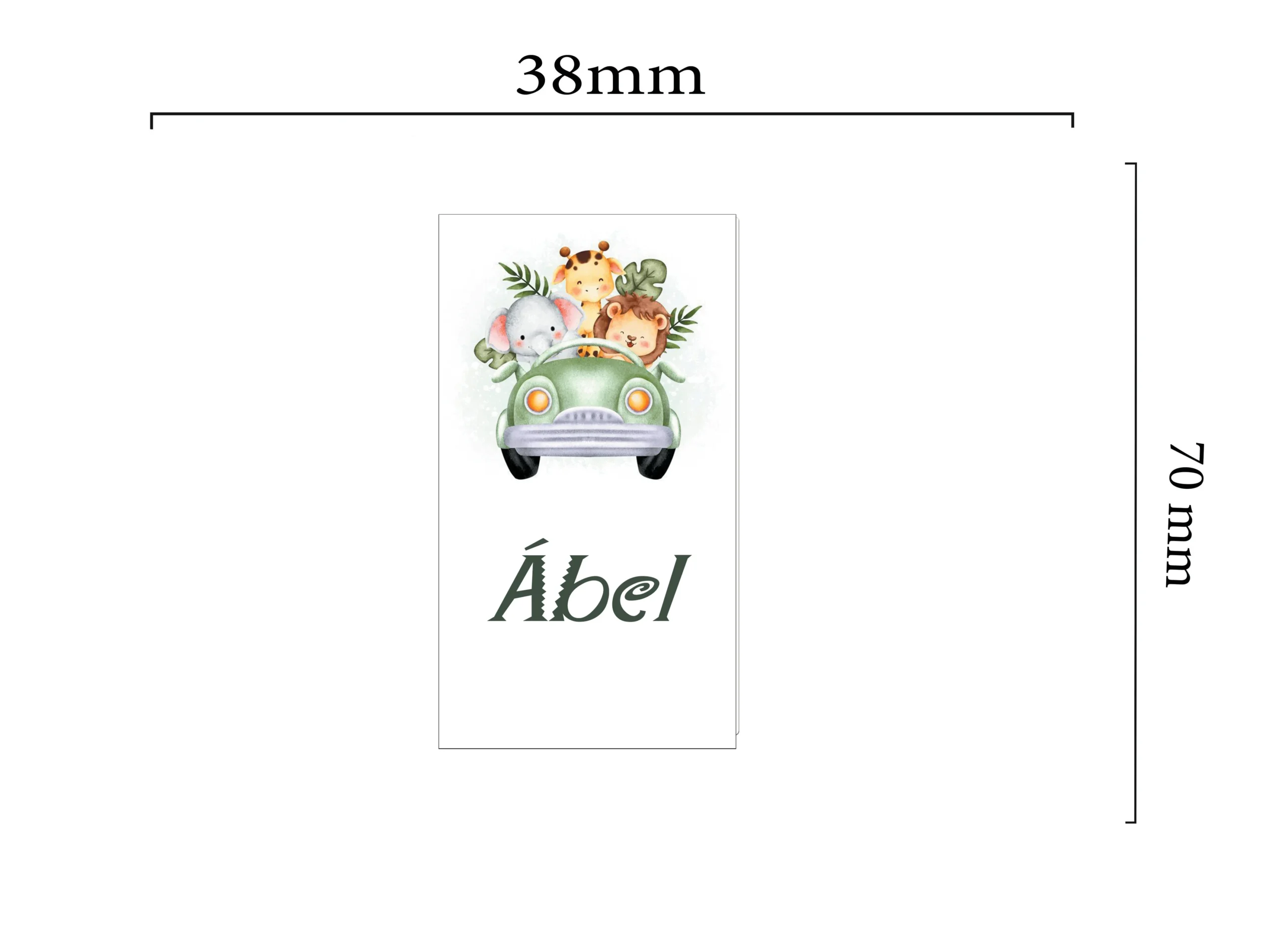 Indítsa el a bulit egy izgalmas szafari-kalanddal! Ez a vidám dzsungel állatos címke egy imádnivaló oroszlánnal, elefánttal és zsiráfal egy kis zöld autóban – garantáltan a gyerekek kedvence lesz! Ideális babazsúrra vagy születésnapi partira!