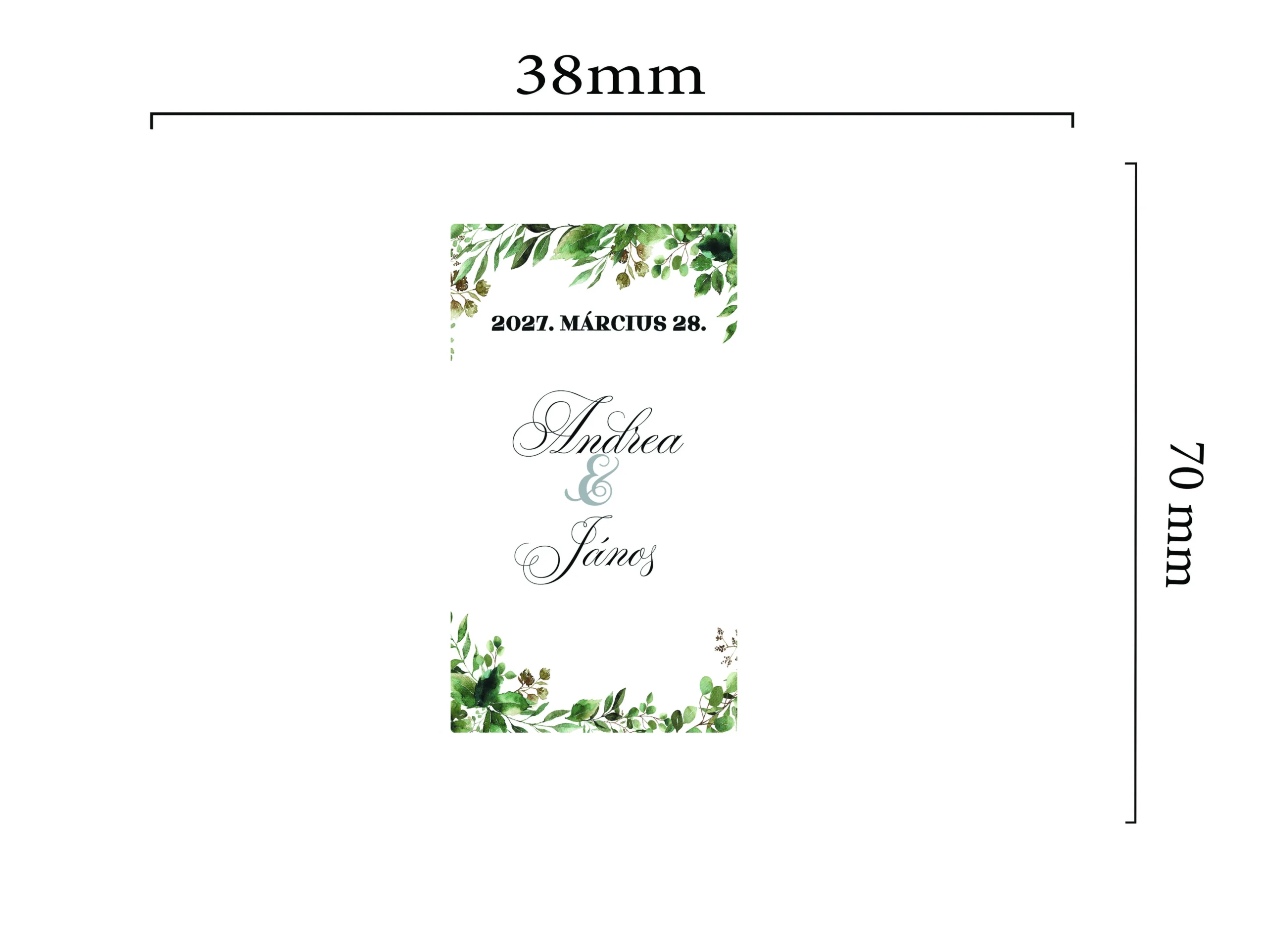 Tedd felejthetetlenné esküvőd minden apró részletét ezzel a gyönyörű, Greenery stílusú egyedi címkével! A friss, zöld levélmotívumok tökéletesen illeszkednek a divatos, természetközeli esküvői témákhoz, legyen szó rusztikus, vintage vagy bohém hangulatról.
