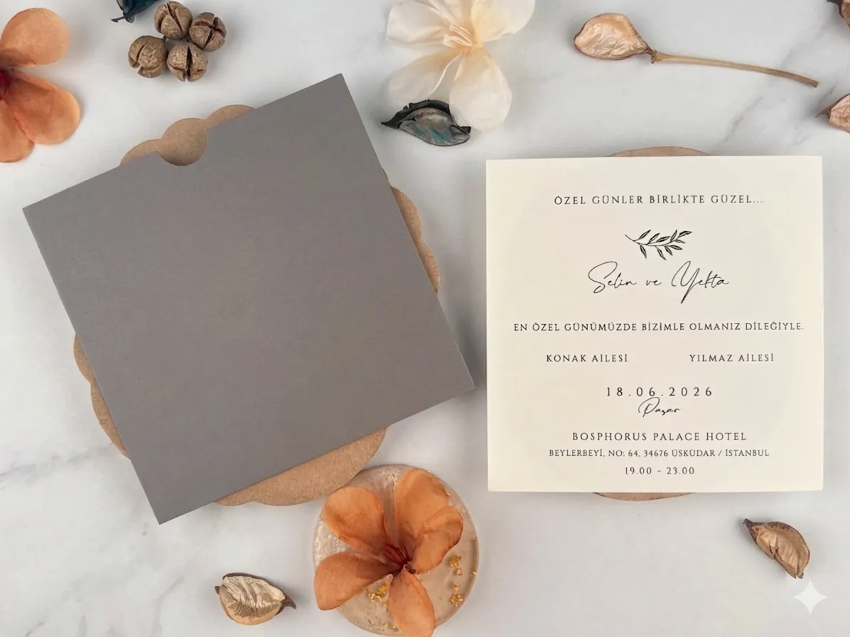 Ez a meghívó a kortárs minimalizmus és a botanikus finomság tökéletes ötvözete, amelyet a semleges, visszafogott színek és a tiszta vonalvezetés határoznak meg.