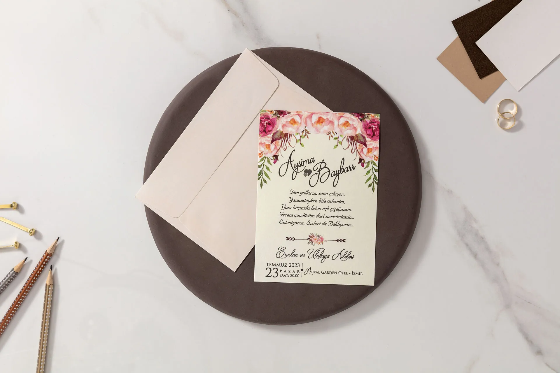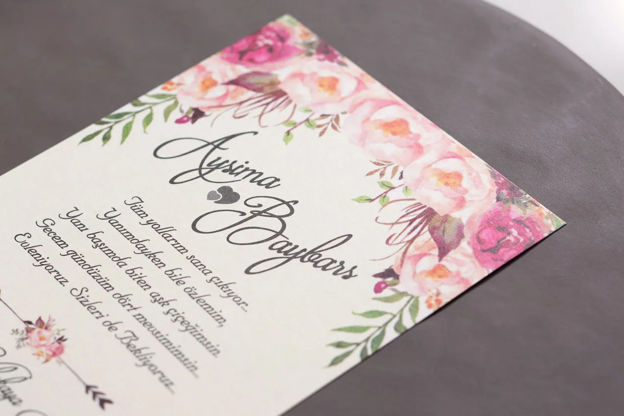 A 10578-IKL-25-ös esküvői meghívó a rózsaszín virágok finomságát ötvözi a klasszikus, romantikus dizájnnal. Az ízlésesen elrendezett virágminta érzelmet és örömöt sugároz, így tökéletes vizuális keretet teremt életetek legszebb napjának bejelentéséhez.