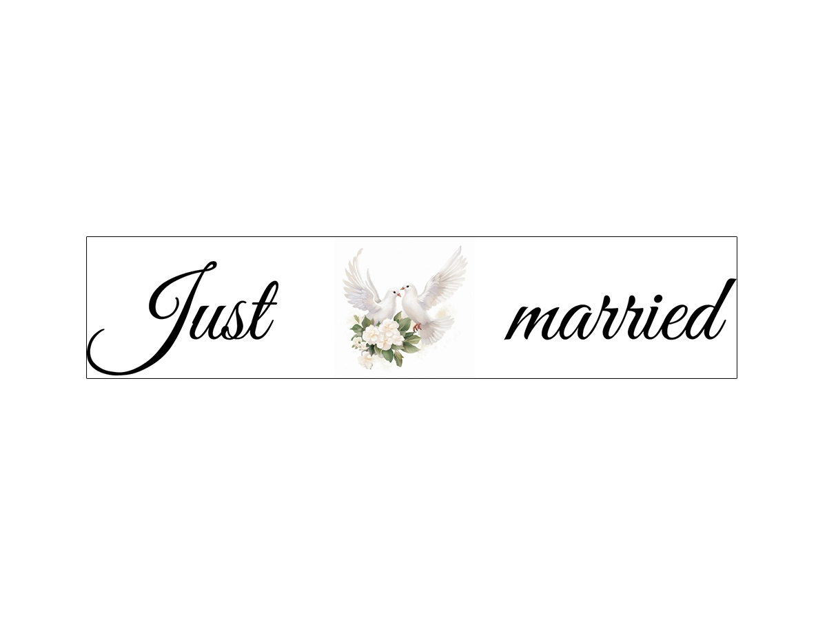 Ünnepeljétek a szerelem szentségét ezzel a különleges „Just married” rendszámtáblával! A tábla közepén két fehér galamb látható, amelyek egy csodás fehér virágcsokrot tartanak. A galambok a hűséget, a békét és a szerelmet szimbolizálják, így tökéletes motívumot jelentenek a friss házasok számára. romantikus hangulatát.