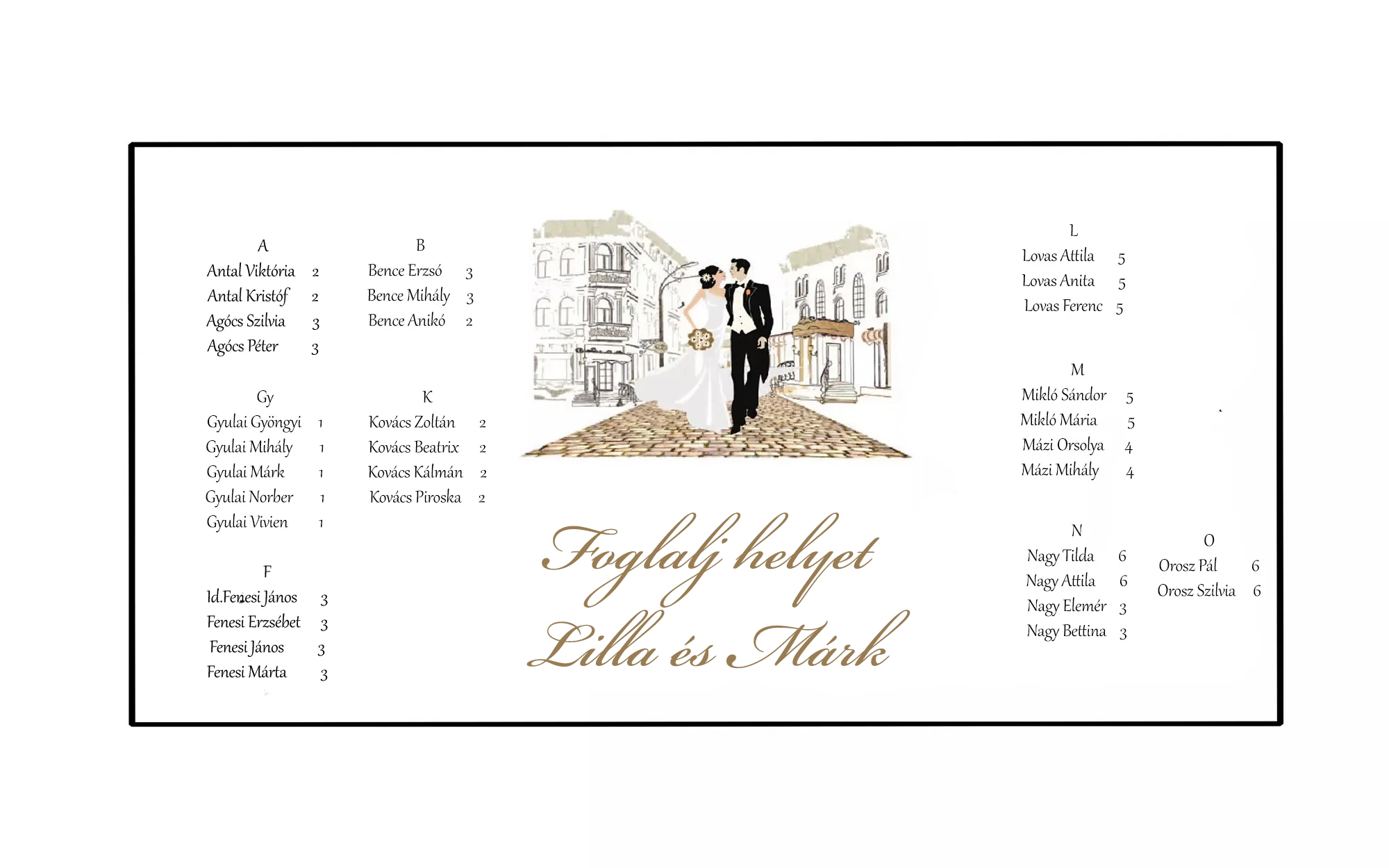 🎨 Design: A tábla központi motívuma egy stílusosan illusztrált kép egy párról – lehet sziluett, portré vagy akár egy romantikus jelenet. Ez köré vagy mellé rendezzük az asztalokat és neveket, ízlésesen elrendezve.